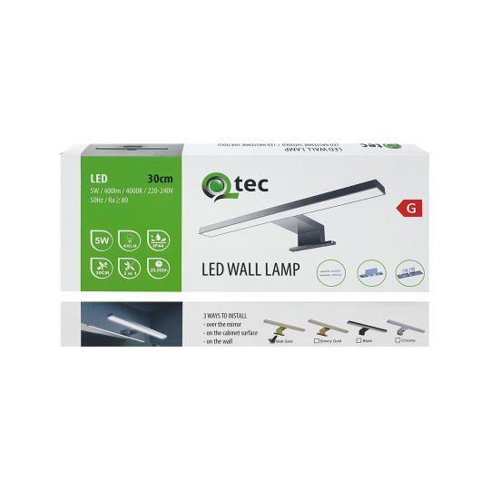 Předností koupelnového nástěnného osvětlení Q-306 Qtec 5W je moderní design, kvalitní zpracování, stupeň krytí IP44 umožňuje instalovat světlo do místnosti se zvýšenou vlhkostí např. koupelny, 3v1 způsoby montáže na zrcadlo, skříňku nebo stěnu. Zdrojem světla jsou energeticky úsporné LED diody, které vyzařují neutrální bílou barvu světla 4000K příjemnou pro oči. Koupelnové osvětlení nabízíme ve 4 barevných variantách - matné zlaté - lesklé zlaté - černé - chrom.
