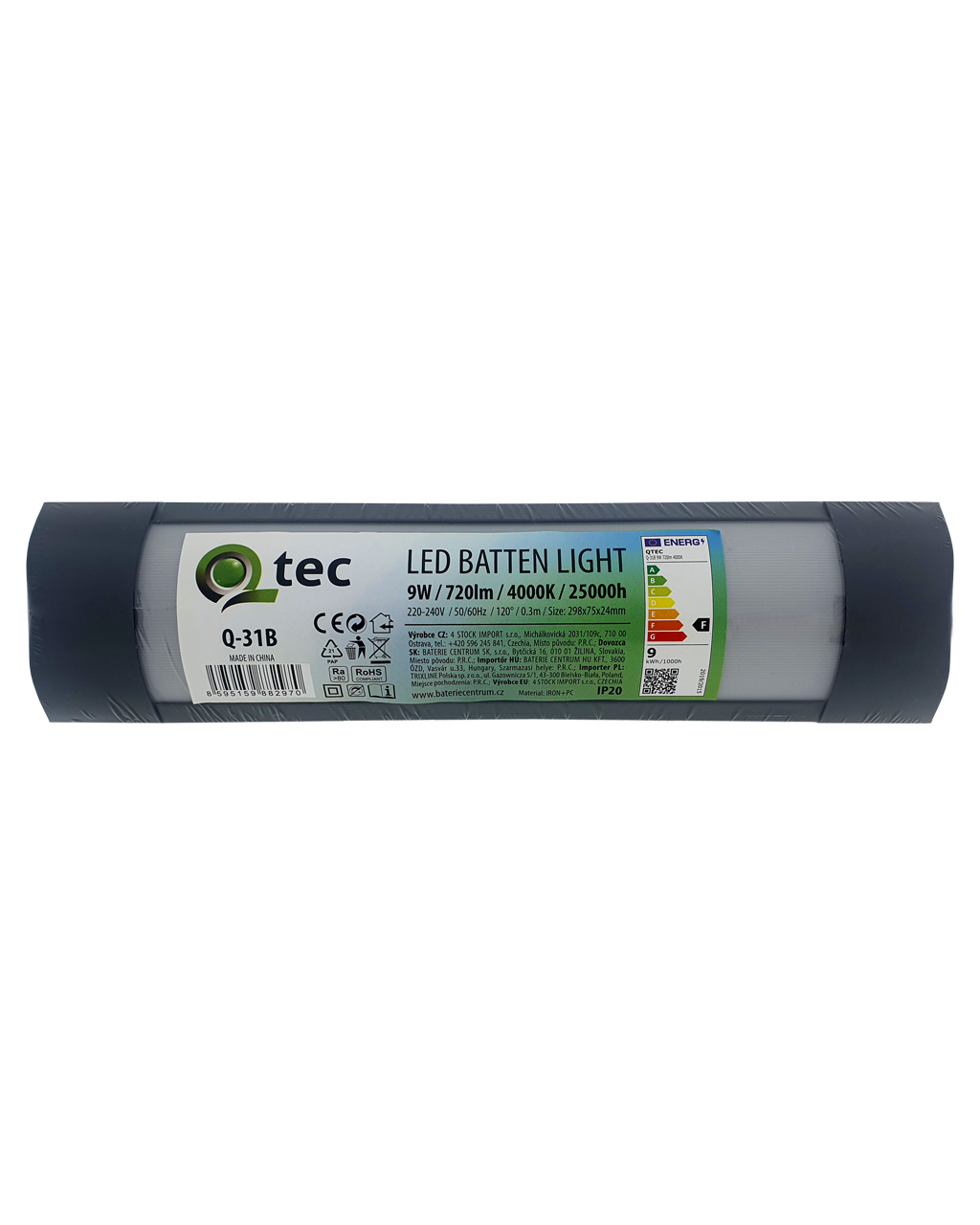 LED podlinkové energeticky úsporné svítidlo 9W 720lm Batten Light Q-31B Qtec. Vyzařuje příjemnou neutrální bílou barvu světla 4000K. Svítidlo má široké, praktické využití lze namontovat do interiéru např. nad kuchyňskou linku, do chodeb, hal, kanceláří, do jídelny, kavárny, obchodu, dílny, garáže apod. V nabídce máme světla ve 2 barevných variantách v černé a v bílé.