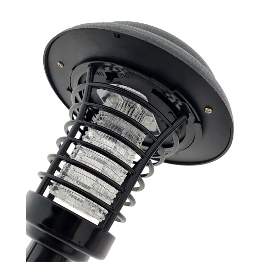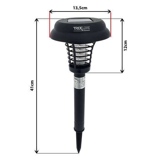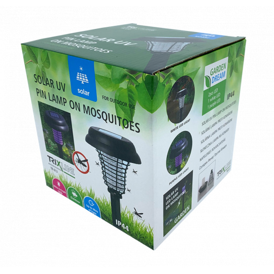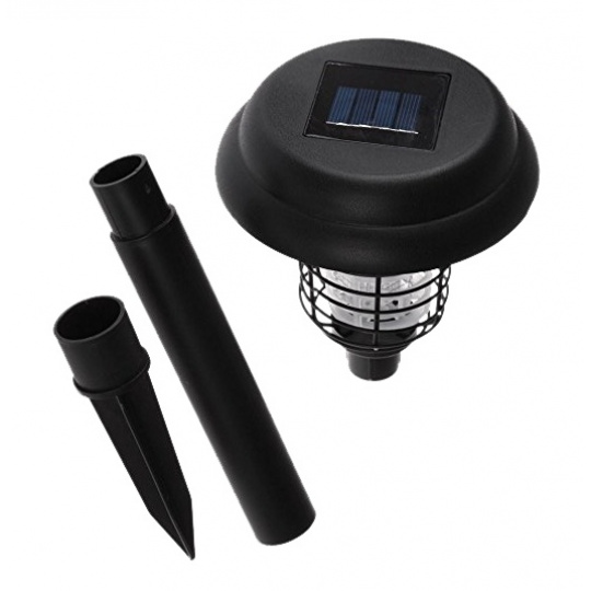 LED solární lampa, s dvěma LED, 1x klasická bílá pro dekorativní osvětlení a 1x UV fialová LED pro likvidaci komárů.