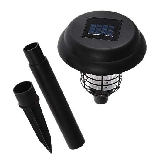LED solární lampa, s dvěma LED, 1x klasická bílá pro dekorativní osvětlení a 1x UV fialová LED pro likvidaci komárů.