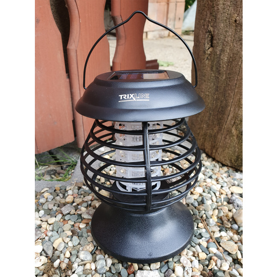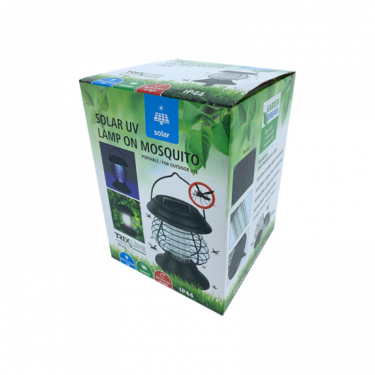 LED přenosná solární lampa, s dvěma LED, 1x klasická bílá pro dekorativní osvětlení a 1x UV fialová LED pro likvidaci komárů. Se stupněm krytí IP44 je chráněna před stříkající vodou ve všech směrech.