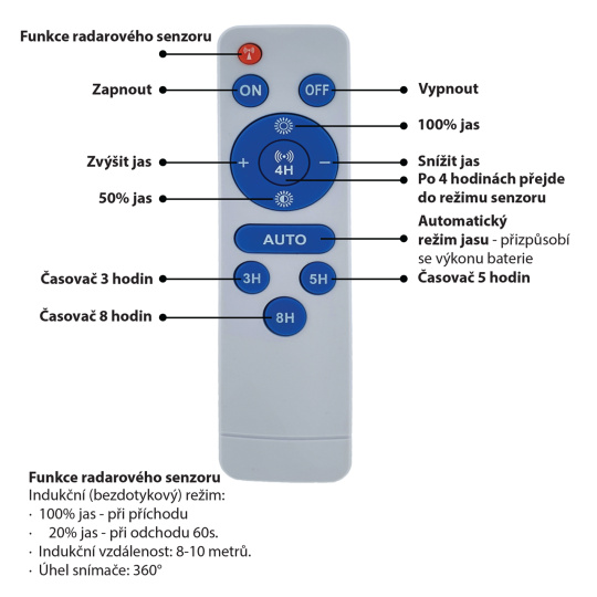 LED solární zahradní světlo s dálkovým ovládáním a mikrovlnným senzorem pohybu je vhodné pro osvětlení zahrady, chodníku rodinného domu nebo příjezdových cest. Je důležité, aby solární panel byl vystaven přímému slunci po celý den, vyhněte se natočení panelů k budovám, stromům a jiným překážkám.