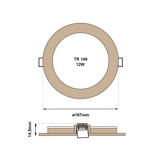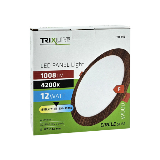 Kruhový vestavný LED panel Trixline TR-146 o výkonu 12W se světelným tokem 1008lm a neutrální bílou barvou světla 4200K. Působivý design v dekoru dřeva. Panel je vyroben z kvalitního hliníku. Díky použité LED technologii ušetříte až 85% energie. Je určen do interiéru k zapuštění do sádrokartónu s montážním otvorem o průměru 15,2cm. Vnější rozměr světla je ø16,7x1,45cm. Rychlá a snadná instalace.