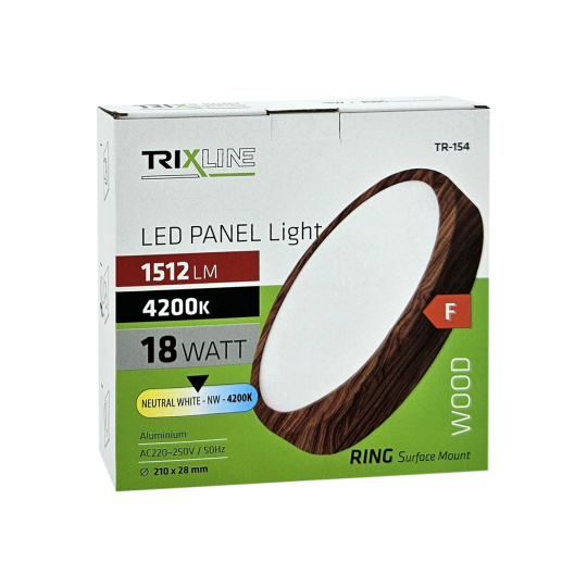 Kruhový přisazený LED panel Trixline TR-154 o výkonu 18W se světelným tokem 1512lm a neutrální bílou barvou světla 4200K. Působivý design v dekoru dřeva. Panel je vyroben z kvalitního hliníku. Díky použité LED technologii ušetříte až 85% energie. Je určen do interiéru. Vnější rozměr světla je ø21x2,8cm. Rychlá a snadná instalace.