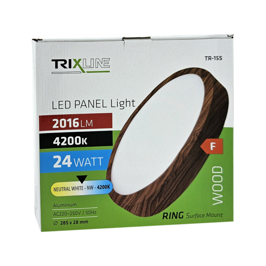 Kruhový přisazený LED panel Trixline TR-155 o výkonu 24W se světelným tokem 2016lm a neutrální bílou barvou světla 4200K. Působivý design v dekoru dřeva. Panel je vyroben z kvalitního hliníku. Díky použité LED technologii ušetříte až 85% energie. Je určen do interiéru. Vnější rozměr světla je ø28,5x2,8cm. Rychlá a snadná instalace.