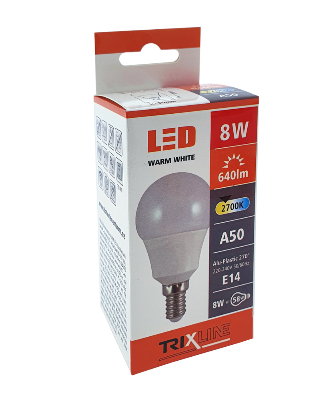 LED ŽÁROVKA TRIXLINE je úsporná LED žárovka s paticí E14, šetrná k životnímu prostředí, neobsahuje totiž žádnou rtuť ani olovo, navíc se dobře osvědčuje i při extrémně nízkých i vysokých teplotách, kdy s vláknovými žárovkami bývají problémy. Její životnost dosahuje až 30 000 hodin. Díky svému výkonu 8W výborně poslouží jako náhrada za klasickou 58W žárovku. LED žárovka se po zapnutí okamžitě rozsvítí bez jakékoliv prodlevy a vyzařuje příjemné teplé bílé světlo 2700K.