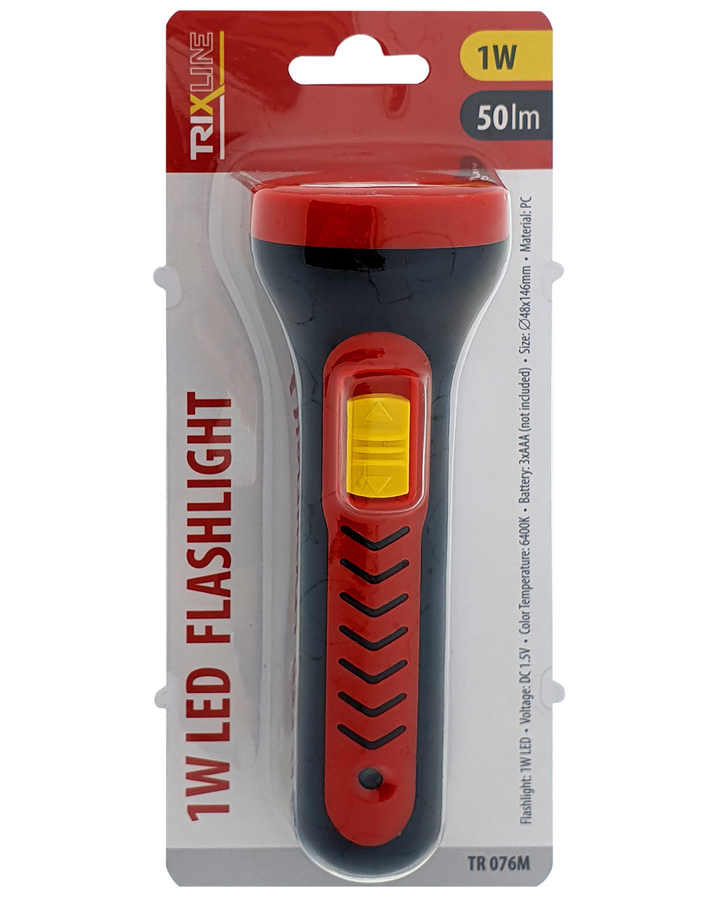 Praktická, lehká LED ruční svítilna TR-076M Trixline se šňůrkou k zavěšení. Je napájena pomoci 2xAA (R6) tužkových baterií (nejsou součástí balení). K zapnutí slouží žlutý vypínač umístěný na těle svítilny. Uvedená cena je za 1ks svítilny. V nabídce máme 4 barevné provedení - černá svítilna s modrým TR 073M, se zeleným TR 074M, s žlutým TR 075M nebo s červeným TR 076M okrajem.