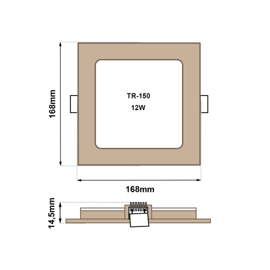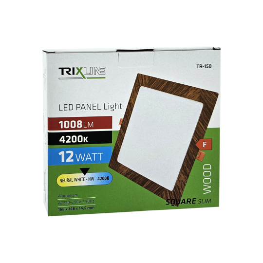 Čtvercový vestavný LED panel Trixline TR-150 o výkonu 12W se světelným tokem 1008lm a neutrální bílou barvou světla 4200K. Působivý design v dekoru dřeva. Panel je vyroben z kvalitního hliníku. Díky použité LED technologii ušetříte až 85% energie. Je určen do interiéru k zapuštění do sádrokartónu s montážním otvorem 15,3x15,3cm. Vnější rozměr světla je 16,8x16,8x1,45cm. Rychlá a snadná instalace.