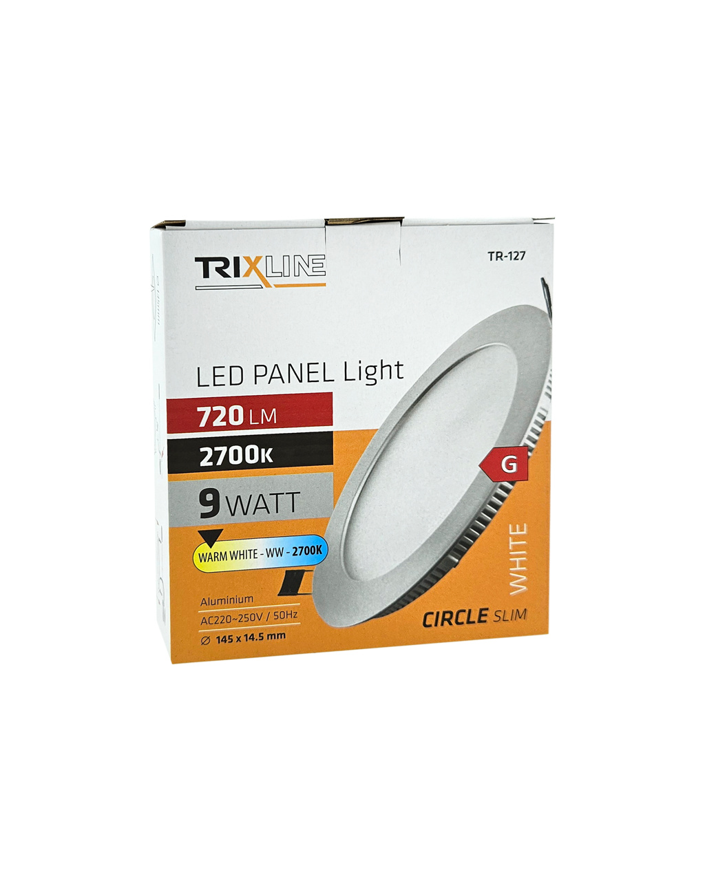 Kruhový vestavný LED panel Trixline TR-127 o výkonu 9W se světelným tokem 720lm a teplou bílou barvou světla 2700K. Teple bílá barva světla zútulňuje prostor, vyvolává pocit pohody a tepla. Je vhodná do místnosti, kde chceme relaxovat a odpočívat. Panel je vyroben z kvalitního hliníku. Díky použité LED technologii ušetříte až 85% energie. Je určen do interiéru k zapuštění do sádrokartónu s montážním otvorem ø13cm. Vnější rozměr světla je ø14,5x1,45cm.