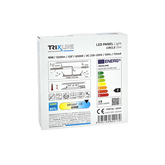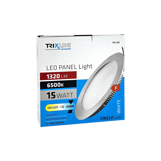 Kruhový vestavný LED panel Trixline TR-129 o výkonu 15W se světelným tokem 1320lm a studenou bílou barvou světla 6500K. Studená bílá barva světla napodobuje jasné denní světlo, je vhodná do prostoru, kde potřebujeme pracovat. Podporuje soustředění a zvyšuje produktivitu. Panel je vyroben z kvalitního hliníku. Díky použité LED technologii ušetříte až 85% energie. Je určen do interiéru k zapuštění do sádrokartónu s montážním otvorem ø17,3cm. Vnější rozměr světla je ø18,8x1,45cm.