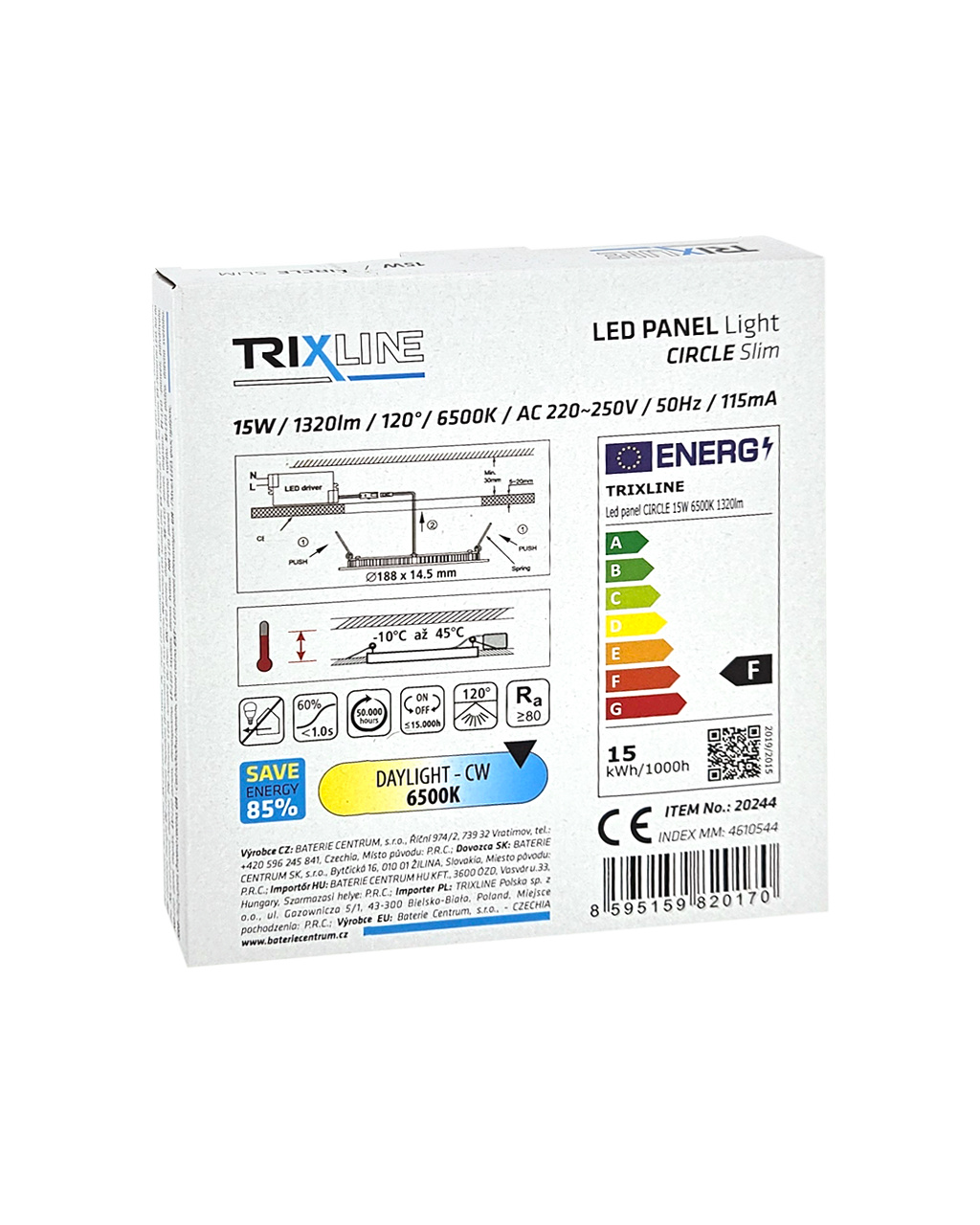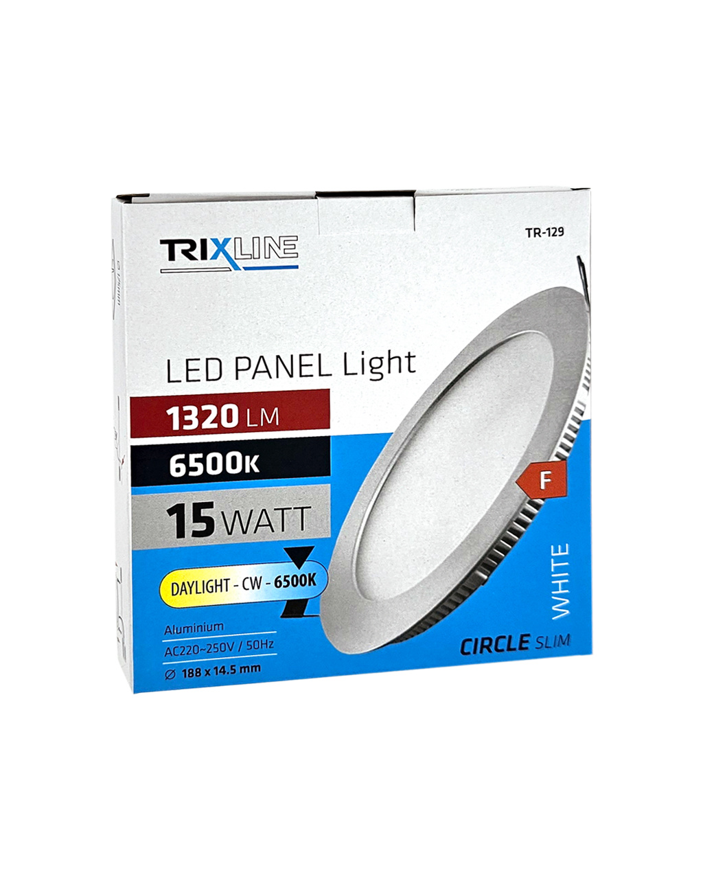 Kruhový vestavný LED panel Trixline TR-129 o výkonu 15W se světelným tokem 1320lm a studenou bílou barvou světla 6500K. Studená bílá barva světla napodobuje jasné denní světlo, je vhodná do prostoru, kde potřebujeme pracovat. Podporuje soustředění a zvyšuje produktivitu. Panel je vyroben z kvalitního hliníku. Díky použité LED technologii ušetříte až 85% energie. Je určen do interiéru k zapuštění do sádrokartónu s montážním otvorem ø17,3cm. Vnější rozměr světla je ø18,8x1,45cm.