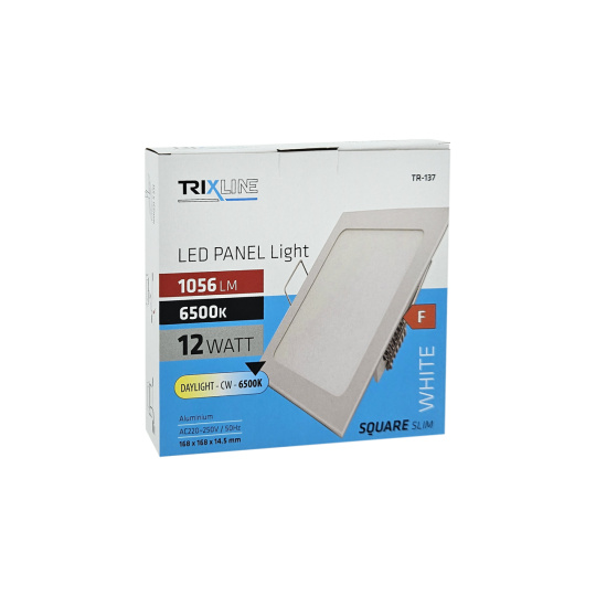 Čtvercový vestavný LED panel Trixline TR-137 o výkonu 12W se světelným tokem 1056lm a studenou bílou barvou světla 6500K. Panel je vyroben z kvalitního hliníku. Díky použité LED technologii ušetříte až 85% energie. Je určen do interiéru k zapuštění do sádrokartónu s montážním otvorem 15,3x15,3cm. Vnější rozměr světla je 16,8x16,8x1,45cm. Rychlá a snadná instalace.