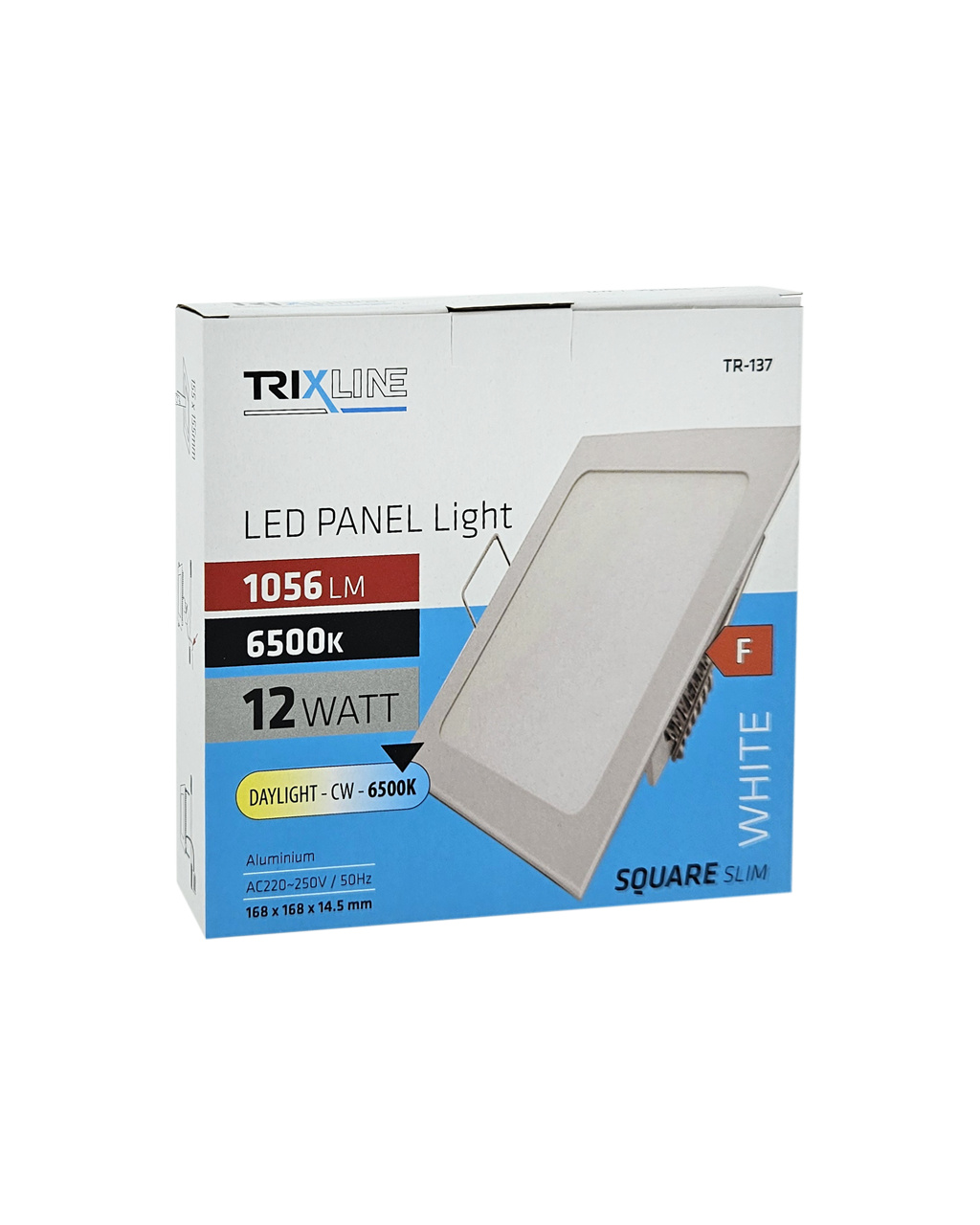 Čtvercový vestavný LED panel Trixline TR-137 o výkonu 12W se světelným tokem 1056lm a studenou bílou barvou světla 6500K. Panel je vyroben z kvalitního hliníku. Díky použité LED technologii ušetříte až 85% energie. Je určen do interiéru k zapuštění do sádrokartónu s montážním otvorem 15,3x15,3cm. Vnější rozměr světla je 16,8x16,8x1,45cm. Rychlá a snadná instalace.