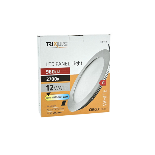 Kruhový vestavný LED panel Trixline TR-144 o výkonu 12W se světelným tokem 960lm a teplou bílou barvou světla 2700K. Teple bílá barva světla zútulňuje prostor, vyvolává pocit pohody a tepla. Je vhodná do místnosti, kde chceme relaxovat a odpočívat. Panel je vyroben z kvalitního hliníku. Díky použité LED technologii ušetříte až 85% energie. Je určen do interiéru k zapuštění do sádrokartónu s montážním otvorem ø15,2cm. Vnější rozměr světla je ø16,7x1,45cm.