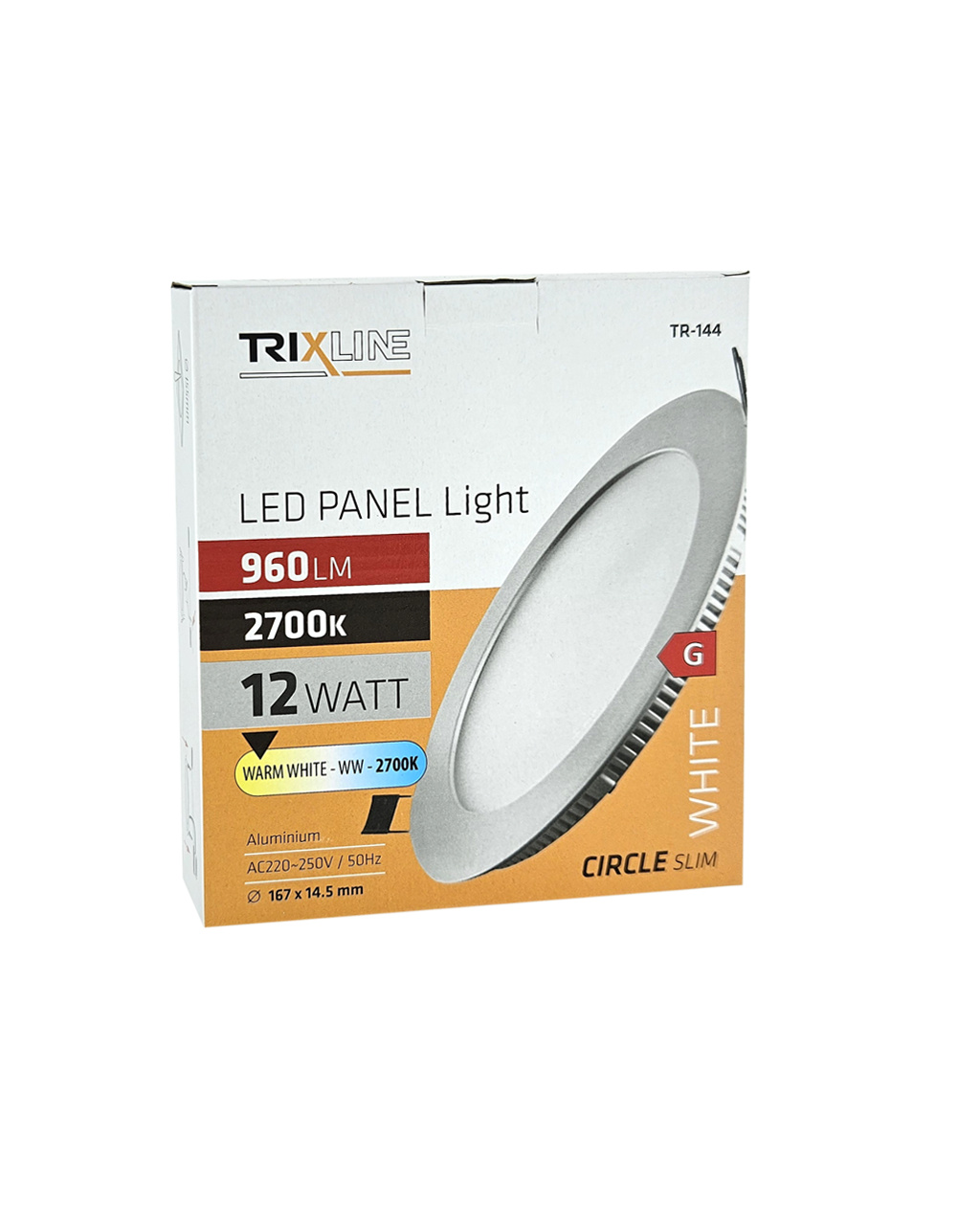 Kruhový vestavný LED panel Trixline TR-144 o výkonu 12W se světelným tokem 960lm a teplou bílou barvou světla 2700K. Teple bílá barva světla zútulňuje prostor, vyvolává pocit pohody a tepla. Je vhodná do místnosti, kde chceme relaxovat a odpočívat. Panel je vyroben z kvalitního hliníku. Díky použité LED technologii ušetříte až 85% energie. Je určen do interiéru k zapuštění do sádrokartónu s montážním otvorem ø15,2cm. Vnější rozměr světla je ø16,7x1,45cm.
