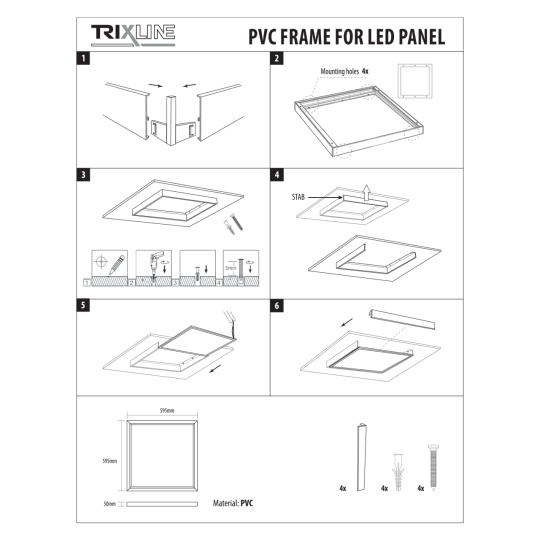 Obsah balení: TR-30A PVC FRAME , návod k použití, 4x šroub 2,5cm - křížová drážka, 4x podložka, 4x hmoždinka
