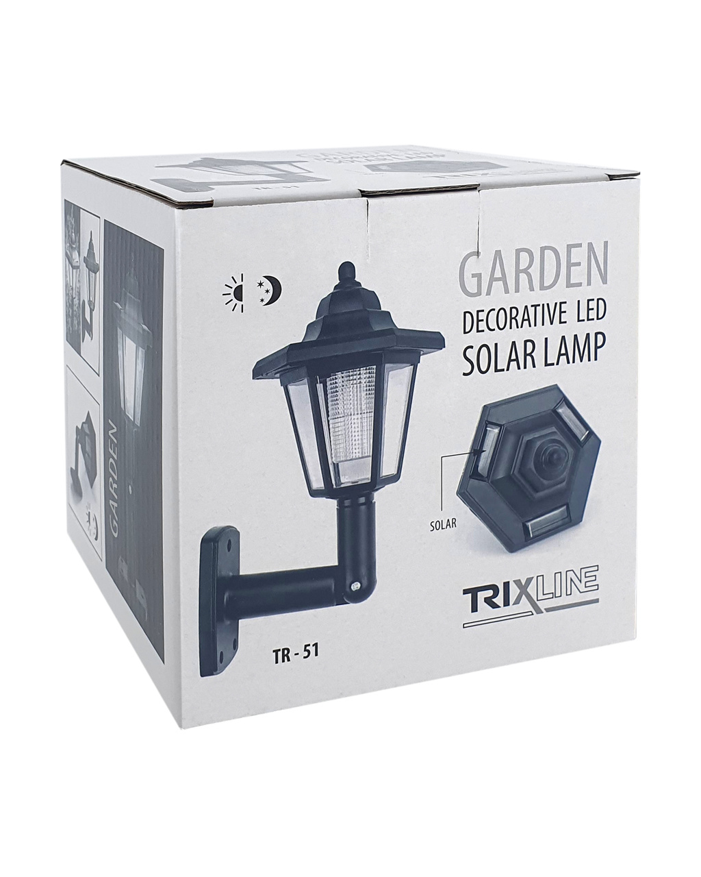 LED solární zahradní lampa TR-51 Trixline. Lucerna lze připevnit ke zdi. Vhodná k dekorativnímu osvětlení zahrady, okolí rodinného domu, balkonů, teras apod. Díky solárnímu panelu ušetříte energii a nejste omezeni připojením do elektrické sítě. Lampa je navržena tak, aby svítila po setmění. Nastavitelný sklon držáku lampy o 180°. Výhodou je nízká hmotnost 163g, menší rozměr lucerny, stupeň krytí IP44 chrání proti stříkající vodě ze všech směrů a proti malým cizím tělesům s průměrem >1 mm.