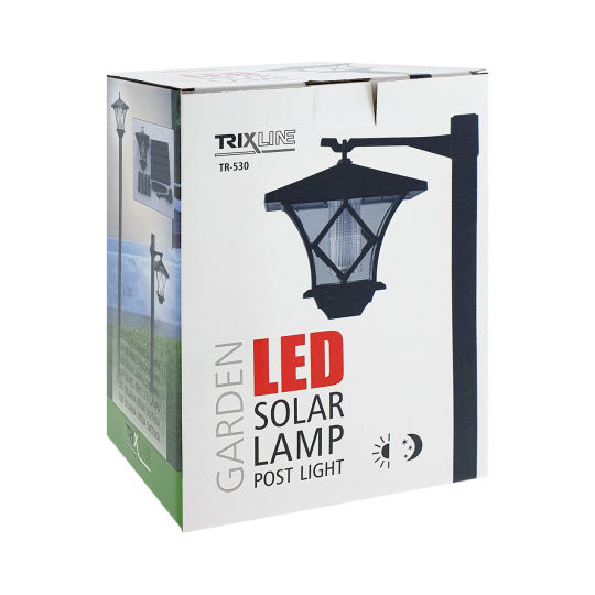 LED solární zahradní lampa TR 530 Trixline. Vhodná k osvětlení zahrady, květinové skalky, balkonů, teras, okolí rodinného domu apod. Díky solárnímu panelu ušetříte energii a nejste omezeni připojením do elektrické sítě. Lucernu je možné připevnit na trávník kotvícím kolíkem. Lucerna má 3 varianty montáže: zavěšení na hák, na tyč nebo lze samostatně pověsit bez podstavce. Lampa je navržena tak, aby svítila po setmění. Plastový kryt s 2 LED chipy vyzařující studenou bílou barvu světla.