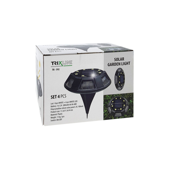 Set 4ks solárních zahradních světel TR-592 Trixline - vhodné pro osvětlení zahrady, trávníku, chodníku rodinného domu, k osvětlení venkovního schodiště apod. Výhodou je odolnost proti vniknutí malých cizích těles (prachu) s průměrem >1 mm, tryskající vodě se stupněm krytí IP44. Můžete si zvolit zda chcete světlo volně položit či upevnit do země zapichovacím podstavcem (součást balení). Před prvním použitím umístěte tlačítko na zadní straně do polohy ON. Po nabití se světlo v noci automaticky rozsvítí a ve dne zhasne. Je důležité aby solární panel byl vystavený přímému slunci po celý den, vyhněte se natočení panelu k budovám, stromům nebo k jiným překážkám.