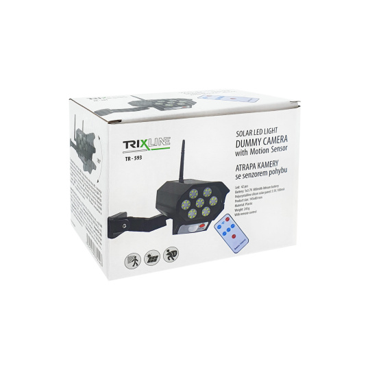 Venkovní výkonné LED 42ks SMD osvětlení TR-593 Trixline - imitace CCTV kamery má zabudovaný solární panel, pohybový senzor s detekcí pod úhlem 120° a dosahem 3-5m. Soumrakový senzor - ve dne se nabíjí v noci rozsvítí. Díky solárnímu panelu ušetříte energii a nejste omezeni připojením do elektrické sítě. Světlo připomíná kameru, osvětlí prostor a tím odradí pohyb nežádoucích osob. Skvělá volba pro osvětlení okolí domu, zahrad, příjezdových cest, stavenišť, garáží, parkovišť, rekreačních pozemků, chat, kempů apod. Vyrobeno z kvalitního plastu se stupněm krytí IP44. Součástí balení je dálkové ovládání. Snadná montáž. Doporučená výška instalace 2-3m nad zemí.