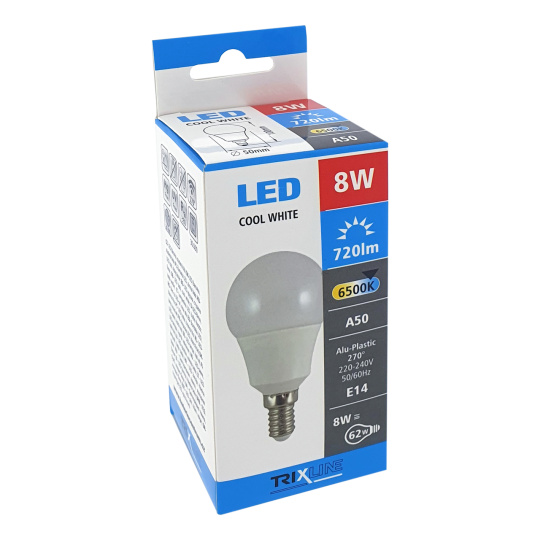 LED žárovka Trixline 8W E14 A50 studená bílá