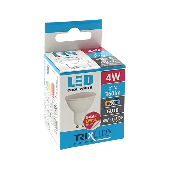 LED BODOVÁ ŽÁROVKA TRIXLINE je úsporná LED žárovka s paticí GU10, šetrná k životnímu prostředí, neobsahuje totiž žádnou rtuť ani olovo, navíc se dobře osvědčuje i při extrémně nízkých i vysokých teplotách, kdy s vláknovými žárovkami bývají problémy. Její životnost dosahuje až 30 000 hodin. Díky svému výkonu 4W výborně poslouží jako náhrada za klasickou 30W žárovku. LED žárovka se po zapnutí okamžitě rozsvítí bez jakékoliv prodlevy a vyzařuje příjemné studené bílé světlo 6500K.